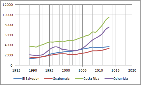 El siguiente gráfico presenta información sobre el Ingreso nacional bruto per cápita para los dos países centroamericanos mencionados, para Colombia y Costa Rica un país centroamericano que ha vivido en paz y con buenos indicadores de equidad y educación[4].